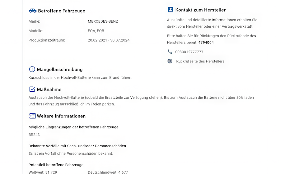 Bei Mercedes EQA und EQB wird ein laufender Rückruf ausgeweitet, nun mit Austausch der Hochvoltbatterie statt bloßer Software-Begrenzung. Weltweit sind über 50.000 Fahrzeuge betroffen, in Deutschland mehrere tausend. Zuvor hatten Ladeleistungs- und Reichweitenbegrenzungen für Unmut gesorgt. Auch beim Volvo EX30 werden in bestimmten Varianten Batteriemodule getauscht.