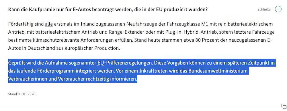 Die Bundesregierung will die finale Förderrichtlinie zur neuen Kaufprämie zeitnah veröffentlichen. Rückwirkend ab Januar 2026 sollen Neuzulassungen förderfähig sein, die Antragstellung ist jedoch erst ab Frühjahr geplant. Zwei Risiken stehen im Raum: mögliche Klagen der Deutschen Umwelthilfe gegen die Ausgestaltung sowie Abstimmungsbedarf mit der EU-Kommission. Nach unserer Einschätzung dürfte Berlin die Förderung zunächst wie angekündigt starten – Anpassungen wären später möglich.