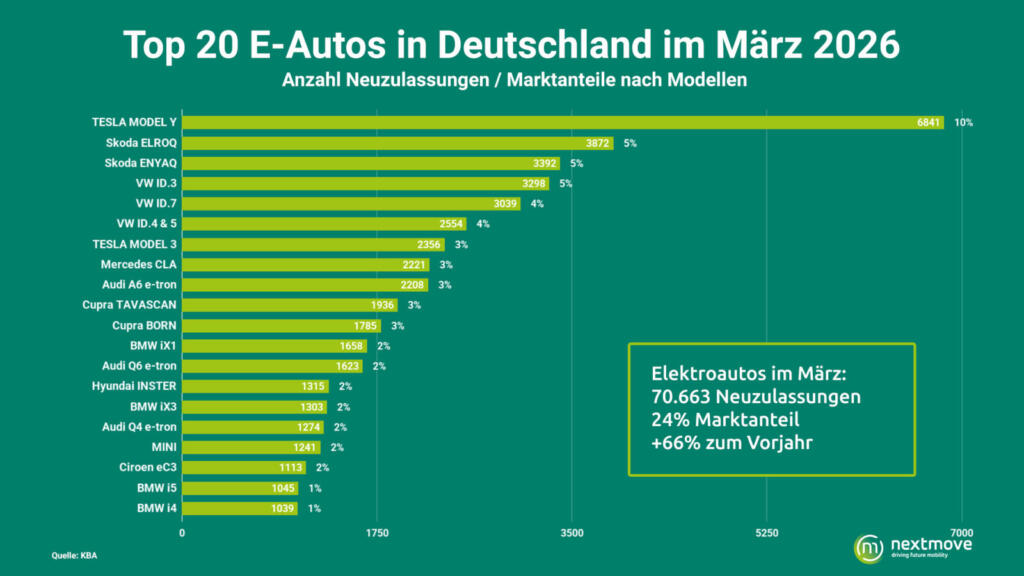 Im März wurden rund 294.000 Pkw neu zugelassen – einer der stärksten Monate der letzten Jahre. Mit über 70.000 Elektroautos erreicht der Markt den drittbesten Wert aller Zeiten. Der E-Auto-Anteil liegt bei 24 Prozent und übertrifft damit sogar klassische Antriebsarten. Besonders auffällig ist das starke Comeback des Tesla Model Y.