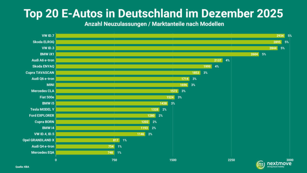 Im Dezember wurden in Deutschland rund 246.000 Pkw neu zugelassen, etwa zehn Prozent mehr als im Vorjahr. Knapp 55.000 davon waren vollelektrisch und bestätigten den hohen Novemberwert nahezu. Besonders stark zeigten sich Modelle auf der MEB-Plattform von VW, ergänzt durch mehrere BMW- und Audi-Modelle. Insgesamt schließt 2025 mit einem neuen Rekordjahr für E-Autos ab.